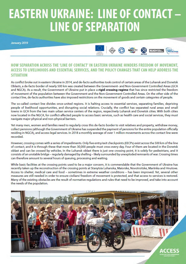 The factsheet looks at how the separation between the Government and Non-Government Controlled Areas of eastern Ukraine, through the so called “Line of Contact”, hinders freedom of movement and affects people’s access to livelihood opportunities and essential services. By analysing the current legislation, the factsheet also explores how decision makers and parties to the conflict can improve the situation regarding movement. This would impact millions of people who are affected by conflict in eastern Ukraine. The factsheet is produced by a group of NGOs which provide humanitarian assistance in eastern Ukraine: People in Need, ACTED, REACH, Médicos del Mundo, Right to Protection, and the Ukraine NGO Forum, with the support of ECHO.