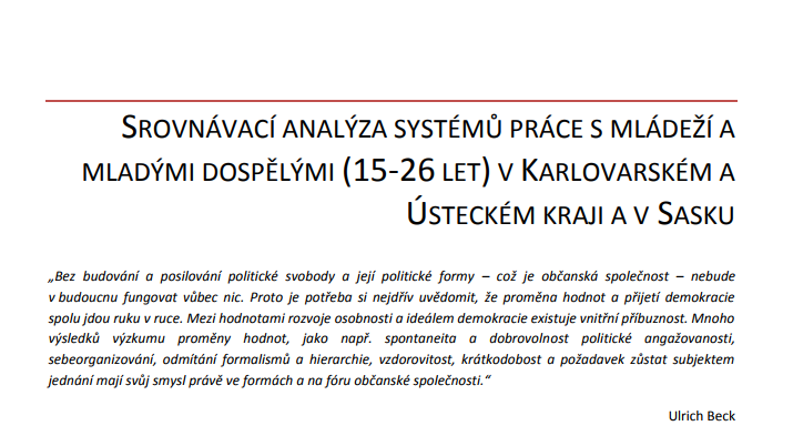 V rámci mezinárodního projektu Inspiration Sachsen byla vyhotovena srovnávací analýza mezi zúčastněnými partnery z Karlovarského kraje, Ústeckého kraje a svobodného státu Sasko. Tato analýza nabízí srovnání práce s mládeží a mladými dospělými a rozbor veřejných rozpočtů a způsobů financování poskytovatelů služeb. Hlavním cílem analýzy rozpočtů vybraných měst bylo zjistit, z jakého důvodu selhávají dosavadní opatření. Ambicí tohoto rozboru má být navrhnout doporučení, které vychází z analýzy empirických dat a srovnání se Saskem, čímž by se mělo dosáhnout zlepšení dosavadního stavu.
