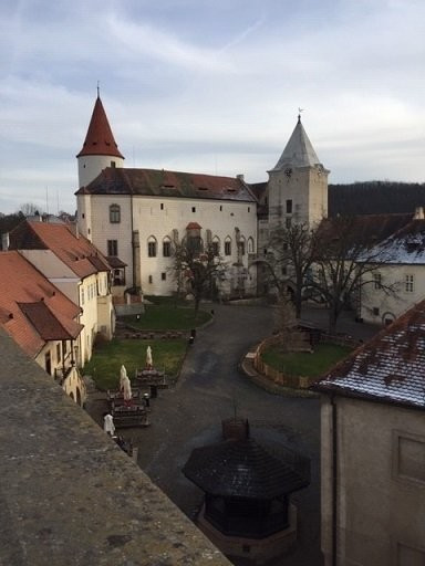 Cestou nám děti vyprávěly, co si přejí k Vánocům, takže nám jízda utekla rychle. Dorazili jsme na místo a měli jsme ještě chvíli čas. Prošli jsme si tedy s dětmi nádvoří a vyšplhali se na věž Huderku, odkud byl krásně výhled na celý hrad a z druhé strany pohled na Křivoklátsko.